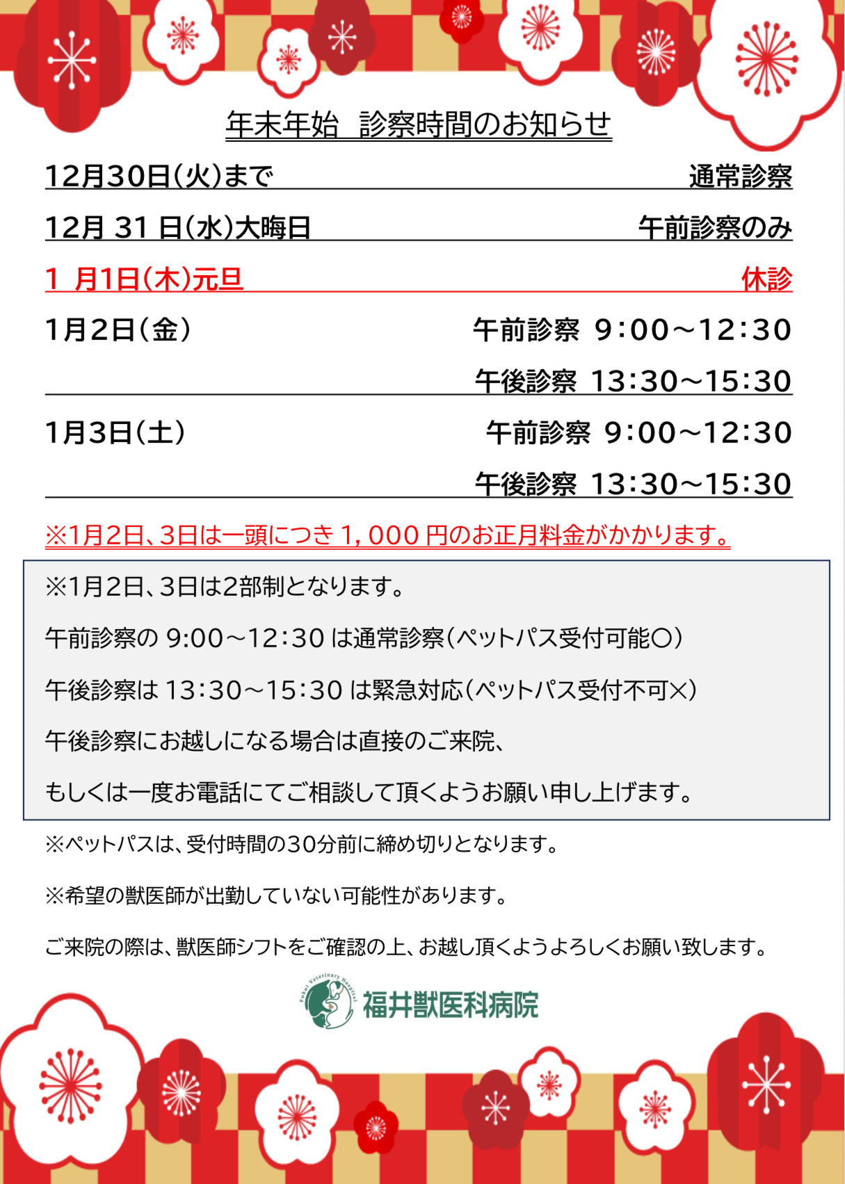 年末年始の診療と診療時間について。