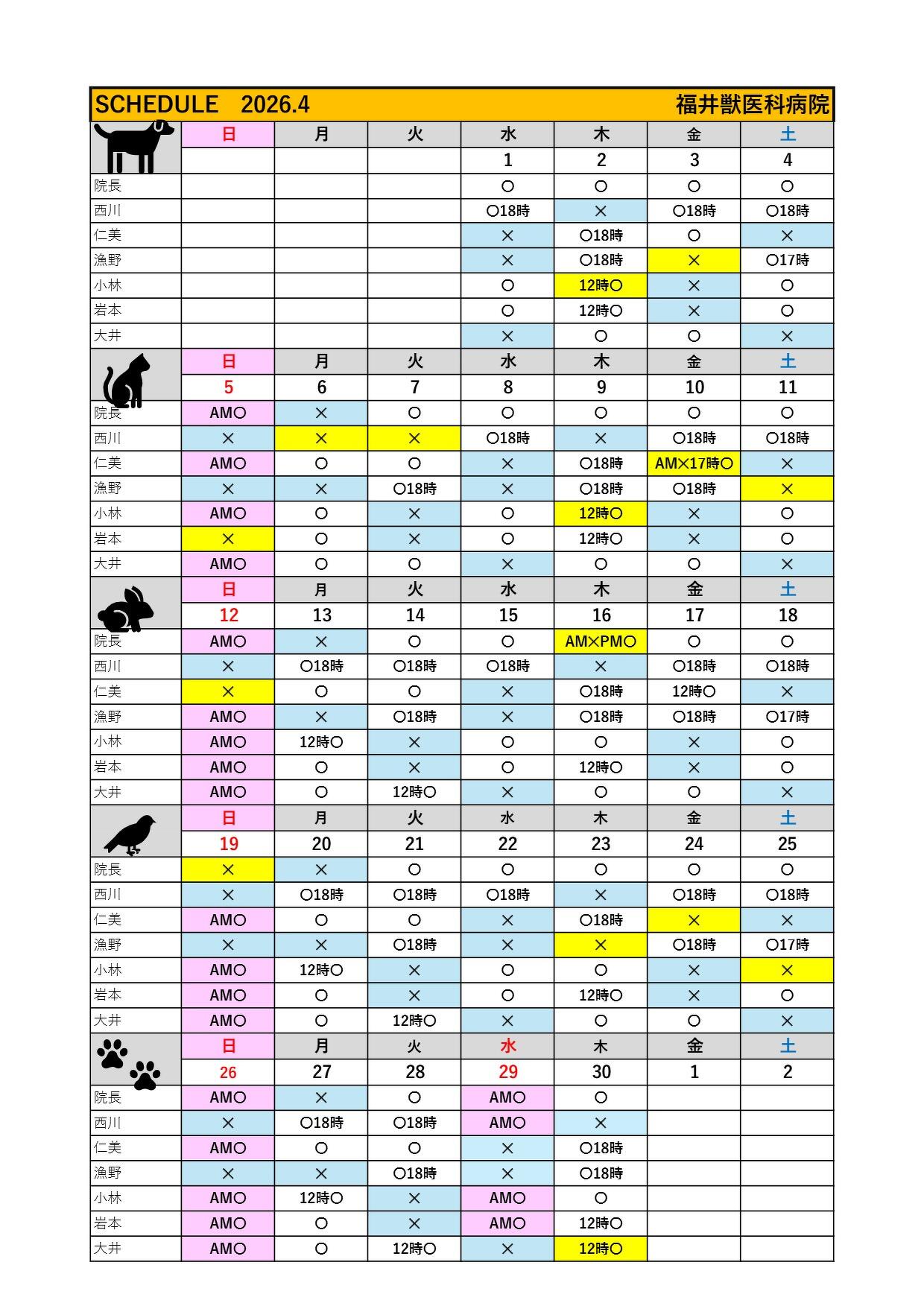 2026年4月の獣医の診察予定です。